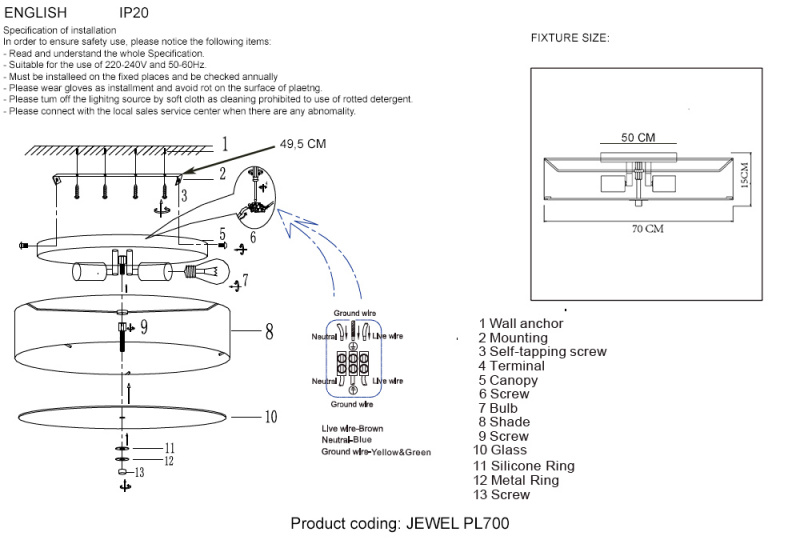Ширина люстры = (Ширина, см + Длина комнаты, см) / 10. |